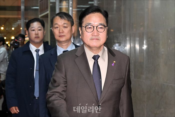 우원식 국회의장이 9일 국회에서 김병기 더불어민주당 원내대표, 송언석 국민의힘 대표와 회동을 갖기 위해 의장실로 향하고 있다.
