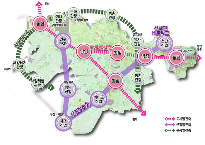 '2도심'은 남양과 동탄으로, 주요 도시 기능을 담당하는 시청이 위치한 행정 거점 '남양'과 경제ㆍ산업ㆍ교통 등 시의 전반적인 경제성장을 견인하는 '동탄'으로 설정됐다. 이를 통해 인접 시군간 광역적 연계와 동서간 균형발전을 도모한다는 계획이다.