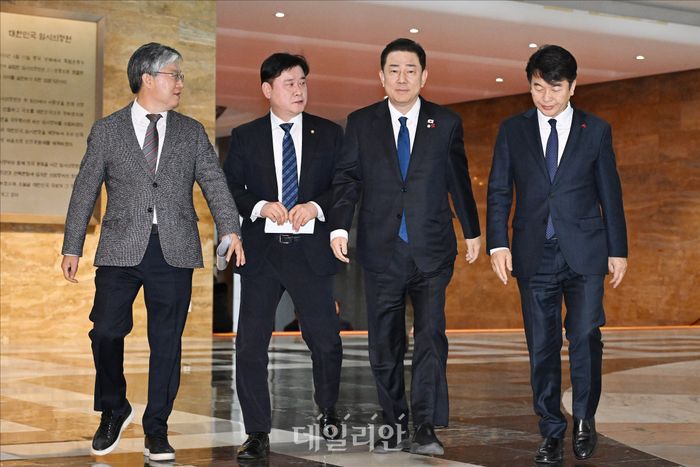김병기 더불어민주당 원내대표가 9일 오후 서울 여의도 국회에서 열린 더불어민주당 비공개 의원총회에서 최근 '인사청탁 문자'로 논란이 된 문진석 더불어민주당 원내운영수석부대표 등과 의총장으로 향하고 있다.