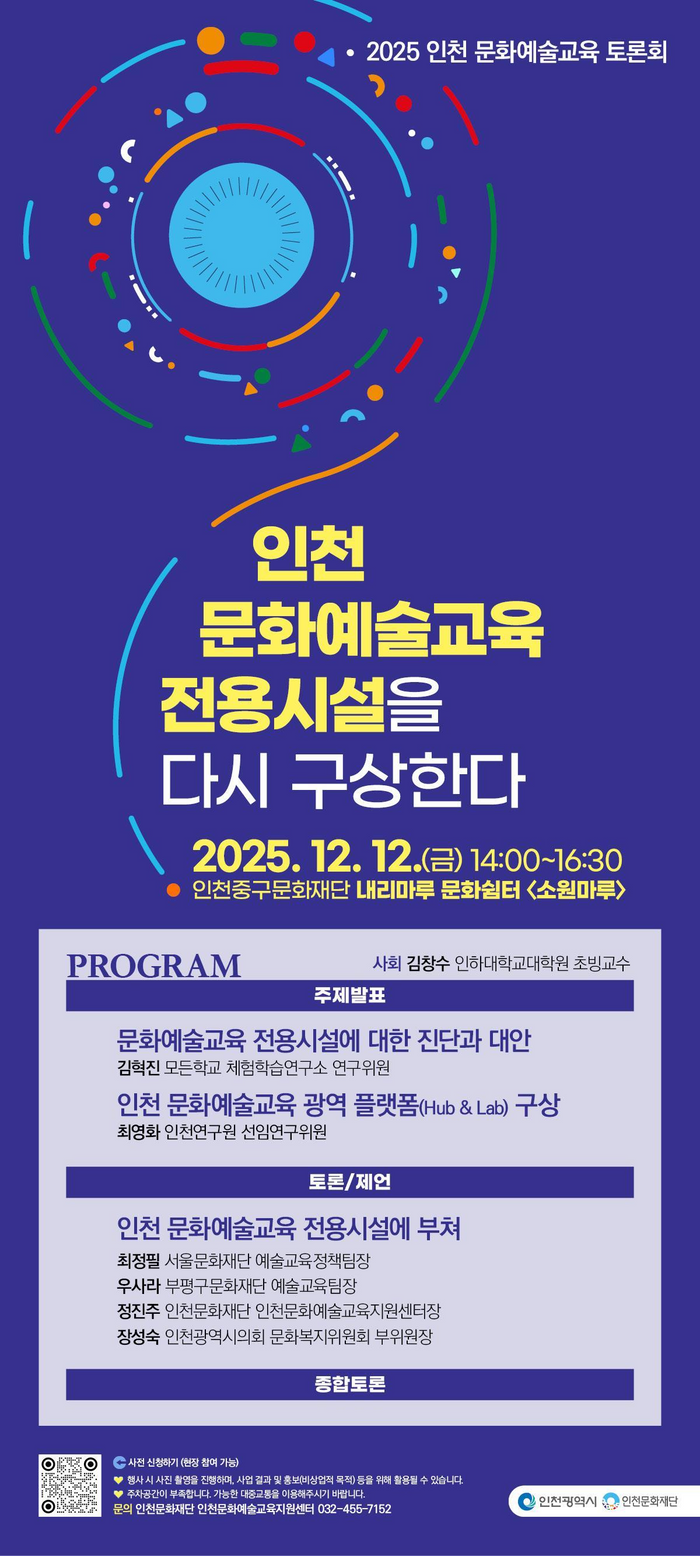 인천문화재단은 오는 12일 중구문화재단 내리마루 문화쉼터에서 ‘2025 인천 문화예술교육 토론회’ 를 개최한다.