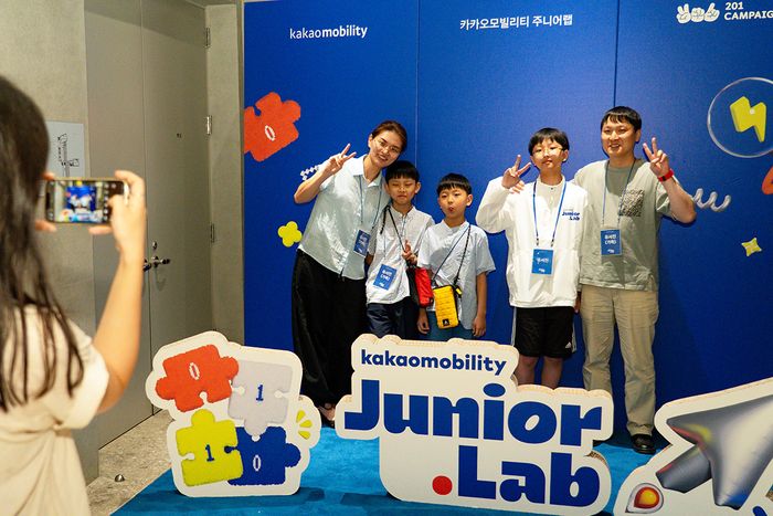 카카오모빌리티의 사회공헌 코딩 캠프 '주니어랩' 참가자들이 기념촬영을 하고 있다. ⓒ카카오모빌리티