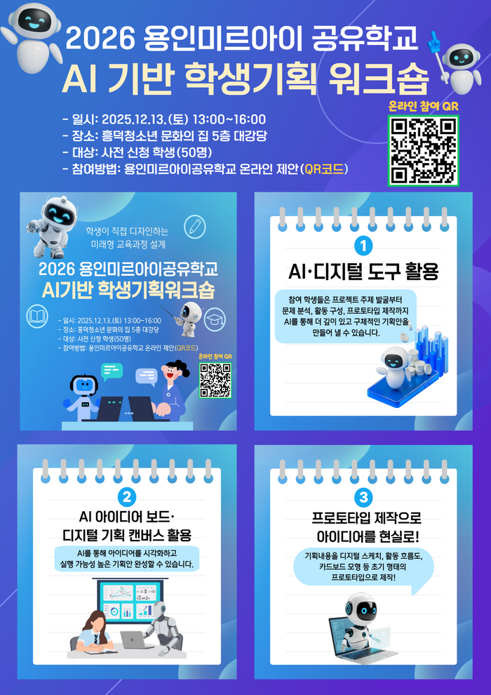 용인교육지원청은 오는 13일 흥덕청소년문화의집에서 AI 기술을 활용해 학생 주도의 창의적 교육 프로그램을 설계하는 '2026 용인미르아이공유학교 AI 기반 학생기획워크숍'을 개최한다고 11일 밝혔다.