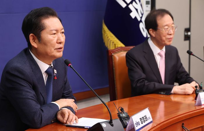 이 위원장은 11일 국회에서 정 대표와 만나 "헌법의 기본 원리나 정신을 일탈하는 정치는 타협의 폭력"이라며 "정치권이 보여주는 이런 점에 대해서는 국민들도 상당히 우려하고 있다"고 작심발언했다. 최근 민주당 차원에서 추진 중인 내란전담재판부 설치법과 법왜곡죄 신설 법안 등을 두고 위헌 논란이 불거진 데 대한 우려로 해석됐다.