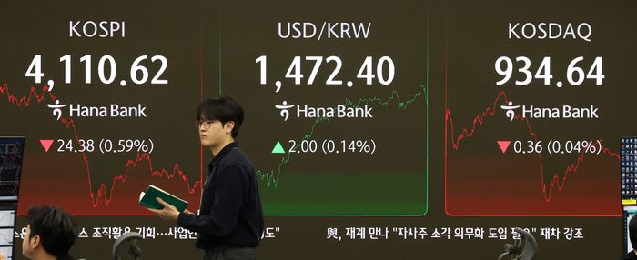 한국거래소에 따르면, 이날 코스피 지수는 전 거래일보다 24.38포인트(0.59%) 내린 4110.62에 장을 마쳤다. 지수는 전장보다 28.32포인트(0.68%) 오른 4163.32로 출발했다.