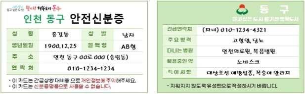 인천시 동구는 개인 혈액형과 주요 병력 등이 기재된 '안전신분증'을 내년부터 주민들에게 지급할 계획이라고 11일 밝혔다.