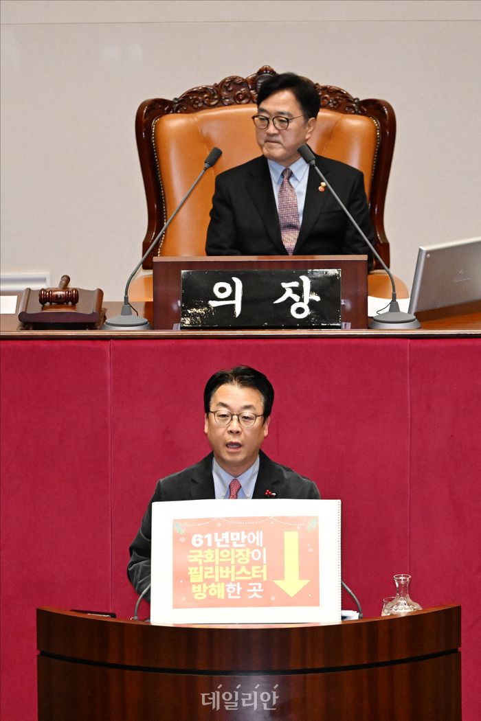 곽규택 국민의힘 의원이 11일 오후 서울 여의도 국회 본청에서 열린 국회 본회의에서 '형사소송법 일부개정법률안(대안)'에 대한 무제한토론(필리버스터)을 하고 있다.
