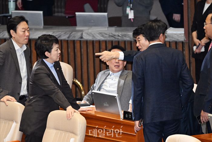 문진석 더불어민주당 원내운영수석부대표가 11일 오후 서울 여의도 국회 본청에서 열린 국회 본회의에서 곽규택 국민의힘 무제한토론 중 손피켓을 사용하자 국민의힘 의원들에게 항의하고 있다.