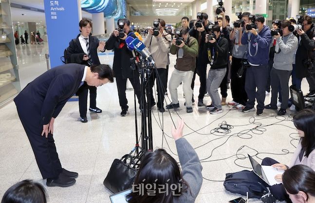 통일교로부터 금품을 수수했다는 의혹이 제기된 전재수 전 해양수산부 장관이 지난 11일 오전 인천국제공항 제2여객터미널을 통해 귀국해 의혹 관련 입장을 밝힌 뒤 인사하고 있다. ⓒ뉴시스