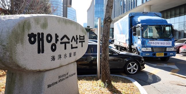 해양수산부가 세종에서 부산 동구 IM빌딩·협성타워 임시청사로 단계적 이전을 시작한 지난 8일 이삿짐을 실은 차량이 정부세종청사 해수부 표지석 앞을 지나고 있다. ⓒ뉴시스