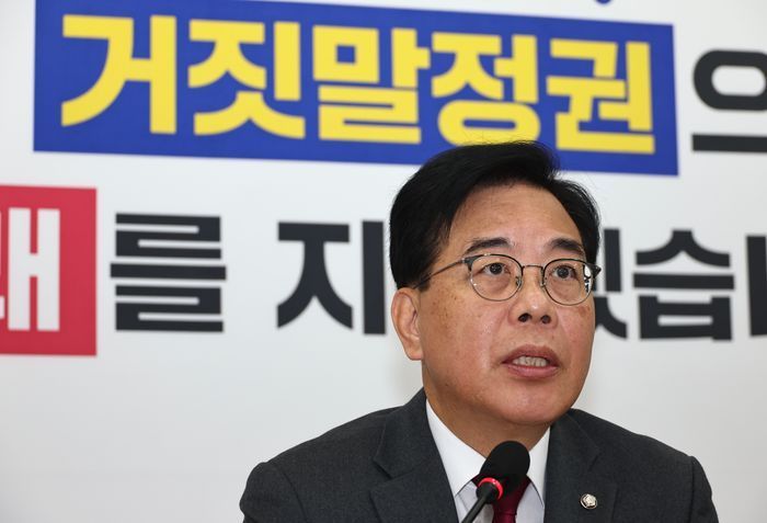 송언석 국민의힘 원내대표가 12일 오전 국회에서 열린 기자간담회에서 발언하고 있다. ⓒ뉴시스