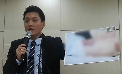 지난 4월부터 최근 까지 중부저선 한 부대에서 선임이 후임을 폭행하고, 성추행한 사건이 발생했다. 사진은 지난달 임태훈 군인권센터 소장이 지난 4월 경기 연천 육군 내무반 내 선임들의 폭행과 가혹행위 끝에 숨진 윤모 일병의 상처 사진을 보여주고 있는 모습.(자료사진) ⓒ데일리안
