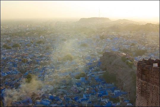 라자스탄 사막의 뿌연 모래먼지와 저 멀리서 천천히 땅으로 내리는 석양, 그리고 마치 그림같이 마을 어디에선가 피어오른 연기는 지독하게도 아름다운 푸른색을 만들어줬다. 뷰파인더로 보이는 모습조차도 너무 안타까워서 어느새 카메라도 내려놓고 성벽에 기대어 그렇게 한참을 멍하니 바라보게 되었다.