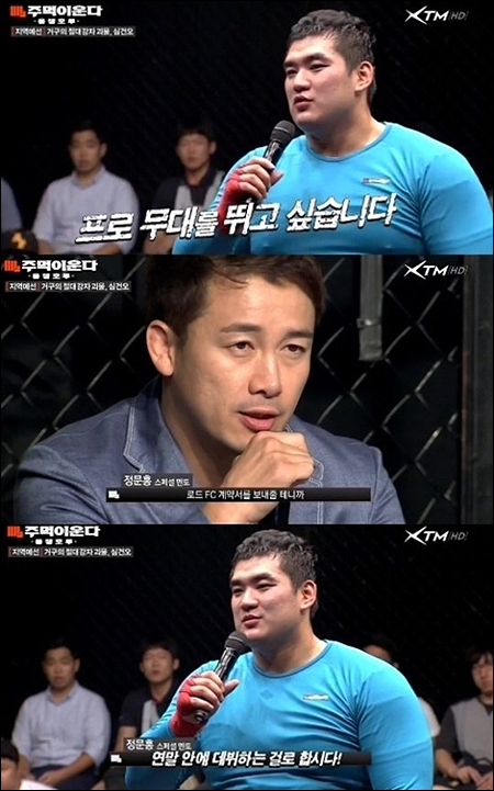 오랜 레슬링 경력에서도 알 수 있듯이 심건오는 단순히 덩치만 큰 인물이 아니다. 지난 9월 25일 방송된 ‘용쟁호투’ 2화에서 손혜석을 묵직한 타격으로 몰아붙이더니 이후에는 차정환을 상대로 난타전을 벌이며 강한 투지와 맷집을 과시했다. 이를 지켜보던 로드FC 정문홍 대표는 곧바로 계약을 제안했고 심건오 역시 이를 받아들였다.