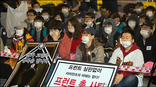 롯데자이언츠 팬들이 5일 오후 부산시 동래구 사직 야구장 앞에서 롯데자이언츠 프런트 운영진의 퇴진을 요구하는 집회를 열고 있다. ⓒ 연합뉴스