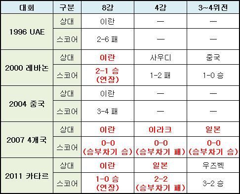 2004년 중국 대회에서 또 8강서 만난 이란에게 3골을 넣고도 4골을 내줘 3-4 충격패를 당한다. 그리고 지난 2007 대회에서는 0-0 무승부로 비긴 뒤 승부차기서 4-2로 앞서 준결승 티켓을 거머쥐었다. 지난 5번의 아시안컵 맞대결 공식 전적은 3무 2패. 물론 세 차례 무승부는 연장까지 이어졌고, 모두 한국이 승부차기 등으로 올라갔다.