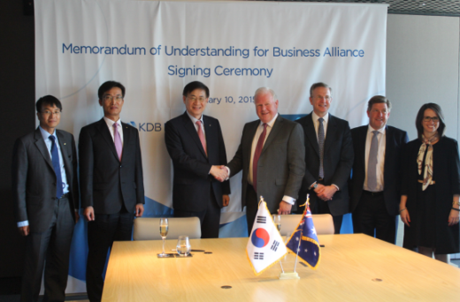 KDB산업은행 임철규 부부장, 노강식 해외사업실장, 홍기택 회장, ANZ 마이클 스미스(Michael Smith) 그룹 회장, 앤드류 제지(Andrew Géczy) 국제.기업금융부문부행장, 앤드류 팔머(Andrew Palmer) 금융그룹부장, 조 미클루스(Jo Mikleus) 비서실장ⓒ산업은행