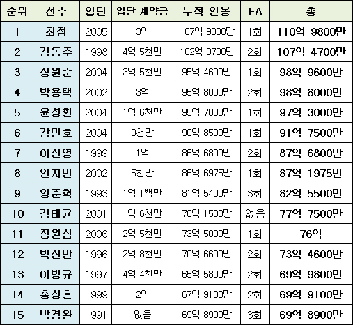 프로야구 역대 누적 연봉 순위. ⓒ 데일리안 스포츠
