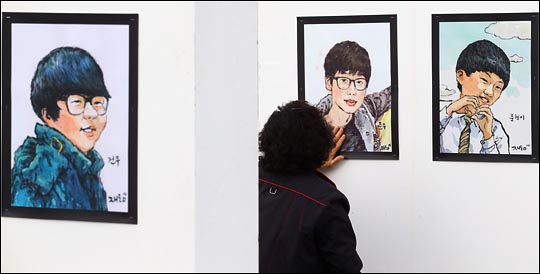 세월호 침몰 참사 1주기인 16일 오전 경기도 안산 세월호 사고 희생자 합동분향소 앞에서 한 조문객이 희생 학생의 초상화를 어루만지고 있다.