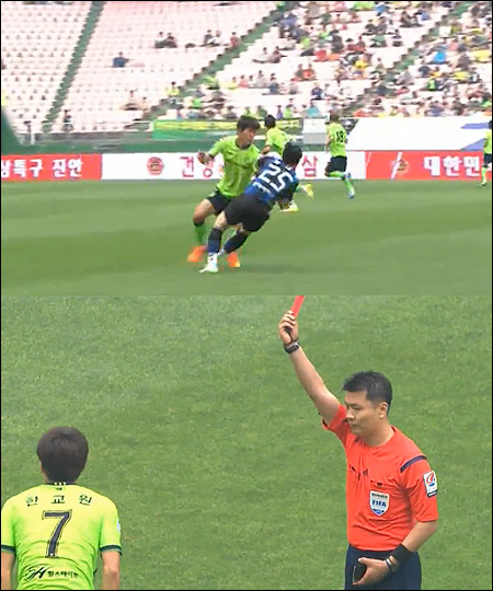 한교원은 지난 23일 인천 유나이티드와 홈경기에서 전반 5분 만에 박대한(24)을 두 차례나 주먹으로 때렸다. 몸싸움 과정에서 박대한과 신체 접촉으로 예민해진 한교원은 먼저 박대한의 어깨를 주먹으로 때렸다가 빗맞자, 심판이 보지 않은 틈을 타 재차 안면을 주먹으로 강타하고 모른 척 자리를 떠나는 비매너 플레이를 저질렀다.