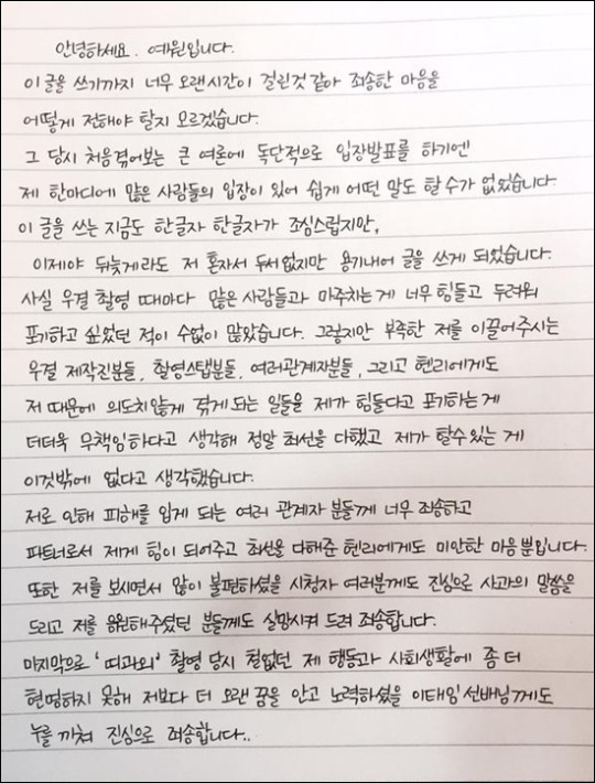 그러면서 "나로 인해 피해를 입게 된 여러 관계자 분께 죄송하고 파트너로서 힘이 돼주고 최선을 다해준 헨리에게도 미안한 마음 뿐이다"며 "나를 보며 많이 불편하셨을 시청자 여러분께도 진심으로 사과의 말씀을 드린다"고 사과의 뜻을 전했다.