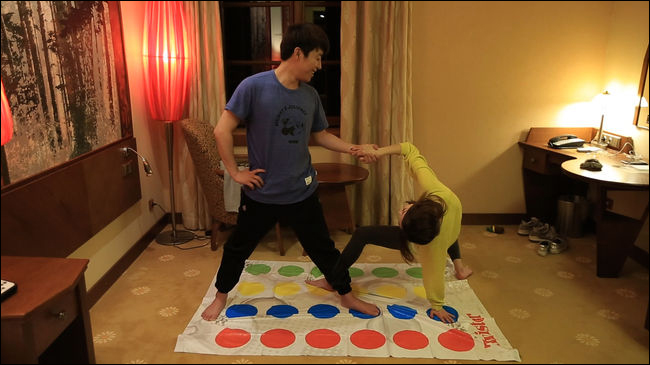 두 사람이 펼친 게임은 손과 발을 이용해 게임판을 지지하고 넘어지지 않아야 이기는 보드게임 트위스터다.