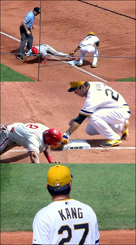 강정호 3루 태그플레이…혀 내두른 재치만점 수비