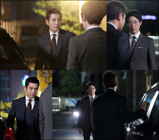 이와 관련 '복면검사' 제작진은 하대철과 강현웅의 9회 촬영 현장 스틸을 공개해 이목을 집중시킨다. 공개된 사진 속 강현웅은 예리한 눈빛으로 하대철을 바라보고 있고, 하대철은 갑자기 나타난 강현웅에 놀란 표정을 짓고 있다.
