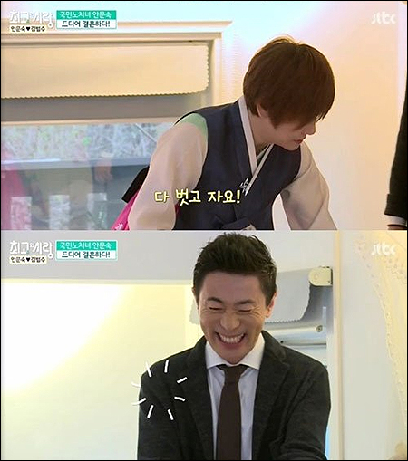 김범수는 안문숙에게 "잘 때 무엇을 입고 자느냐"라고 물었고, 안문숙은 "다 벗고 잔다"고 말해 후끈한 분위기를 연출했다. 안문숙은 이어 "우리 늦게 결혼했으니까 젊은 애들이 하는 건 다 흉내내자"고 말했다.