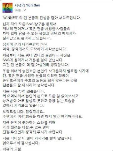 서유리는 13일 자신의 페이스북을 통해 "'WINNER' 의 팬 분들께 진심을 담아 부탁드립니다"라는 내용의 글을 게재했다.