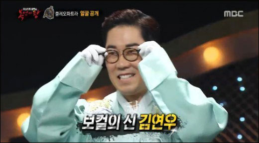 김연우는 19일 오후 방송된 '복면가왕'에서 처음으로 복면을 벗고 얼굴을 드러냈다. 그간 4연승을 하며 승승장구 한 '클레오파트라'는 새로운 도전자 '노래왕 퉁키'와의 대결에서 아쉽게 패해 가면을 벗었다.