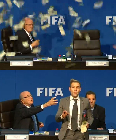 사퇴를 결심한 제프 블래터 FIFA 회장이 이번에는 돈다발이 뿌려지는 굴욕을 맛봤다.