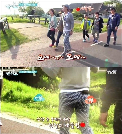 이날 주부들과 함께 산책에 나선 박정철은 꽉 끼는 바지를 입고 등장, 엉덩이에 눈길이 쏠리도록 했다. 당연히 주부들은 박정철의 엉덩이를 보며 “오메”라는 감탄사를 이어나갔다.