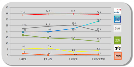 데일리안이 의뢰해 여론조사기관 알앤써치가 실시한 1월 넷째주 정례조사에 따르면, 새누리당의 지지율은 34.4%, 더민주는 28.6%, 국민의당 11.8%, 정의당 4.1%, 국민회의 0.6%로 조사됐다.