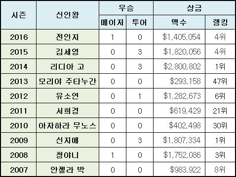 지난 10년간 신인왕 및 상금. ⓒ 데일리안 스포츠