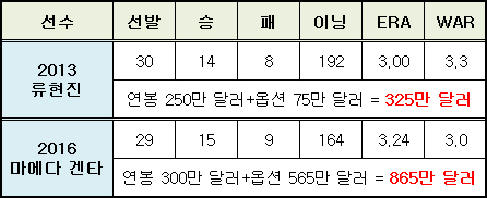 보장 연봉도 마에다보다 높다. 류현진은 다저스와 6년간 3600만 달러의 계약을 맺었고, 추가로 600만 달러의 옵션을 매겼다.