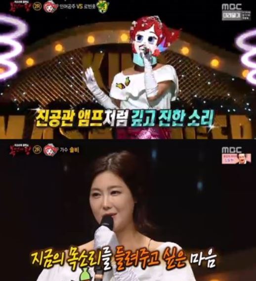 ‘정의의 로빈훗’에게 석패한 ‘노량진 인어공주’가 가면을 벗고 솔비가 정체를 드러냈다. 최근 예능에서 맹활약하며 주가를 올리고 있는 솔비의 등장에 신봉선은 “노래를 너무 잘해 솔비일거라고 전혀 생각 못했다. 미안하다”라고 사과를 하기도 했다. 솔비는 “성대 결절이 왔었기 때문에 출연을 주저했었다. 많은 분들이 10년 전 목소리를 기억해주시는 것 같아 지금 내가 가진 목소리를 들려드리기 위해 나왔다”라며 “1라운드 후 선배님들의 칭찬에 힘과 용기를 얻어 노래했다”라고 촉촉해진 눈가로 소감을 전했다.