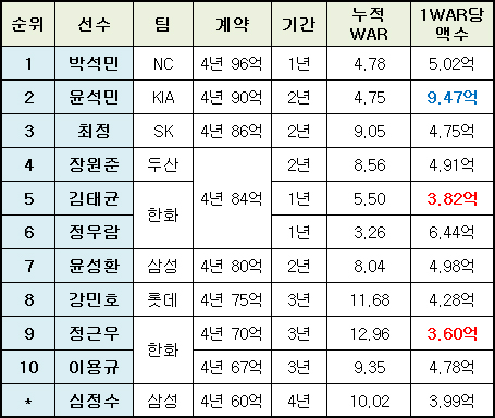 최형우 이전 역대 최고액이었던 NC 박석민(연간 24억 원)은 계약 1년차인 올 시즌 4.78 WAR(1WAR당 5.02억 원)를 기록하며 순항을 시작했다. 또한 한화의 동갑내기 듀오 김태균(1WAR당 3.82억 원)과 정근우(1WAR당 3.60억 원)는 투자 대비 가장 효율적인 계약임을 입증하고 있다.