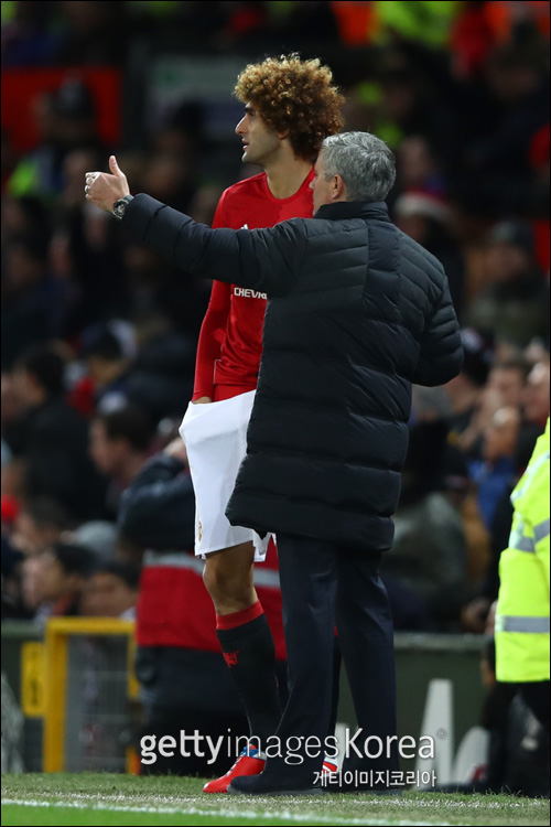 무리뉴 감독이 교체 투입을 준비하고 있는 펠라이니에게 작전 지시를 내리고 있다. ⓒ 게티이미지