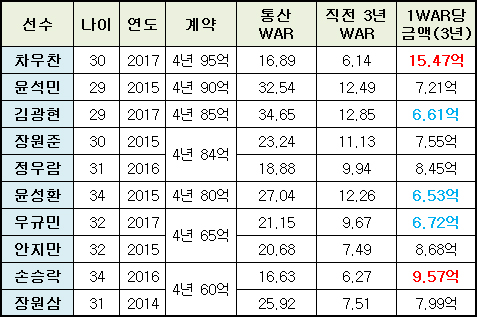 60억 원 이상의 대형 투수 FA들 중 차우찬을 제외한 9명은 자격 획득 직전 3년간 연평균 3.32WAR를 기록했고, 1WAR당 7.70억 원의 평가를 받았다. 연평균 23억 7500만 원의 차우찬이 거액 투수 FA들의 평균치에 근접하려면 최소 9이상의 WAR를 기록해야 한다는 계산이 나온다.