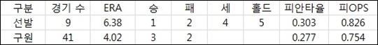 KIA 홍건희 2016시즌 선발 및 구원 등판 기록. ⓒ 케이비리포트/스탯티즈