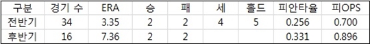 선발 로테이션 완주를 위해서는 체력 뒷받침은 필수다. 하지만 지난 시즌 홍건희는 부상 탓도 있지만 전반기보다 후반기가 좋지 않았다. 전반기 34경기 3.35의 평균자책점 0.700의 피OPS를 기록했지만 후반기에는 16경기 7.36의 평균자책점 0.896으로 세부 지표가 치솟았다.