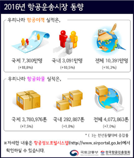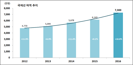 국제선 여객은 7300만명으로 2015년보다 18.8% 증가했다. 저비용항공사(LCC)의 공급 확대와 환율 하락 등으로 내국인의 여행 수요가 커졌다. 또 한류에 대한 인기가 높아지며 외국인 관광객도 증가했다. 2015년 상반기 국내에서 유행했던 메르스(중동호흡기증후군) 기저효과도 한몫했다.