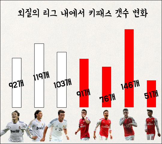 리그에서 외질의 키패스 수치는 2011-12시즌을 기점으로 하락세를 보이고 있다. 물론 지난 시즌 키패스 146개라는 역대급 기록을 남기며 프리미어리그 도움왕에 이어 아스날 올해의 선수까지 수상했다.