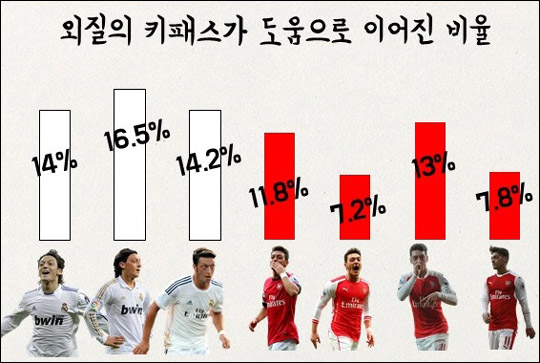 외질의 2010/11시즌 이래로 키패스 수치 비교. ⓒ 데일리안 박철민