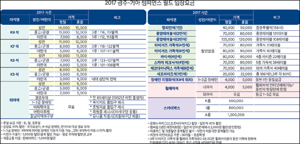 K9, K7, K5, K3, 외야석 가격은 평일 기준이며, 휴일에는 각각 1000원 인상된 가격으로 판매한다.