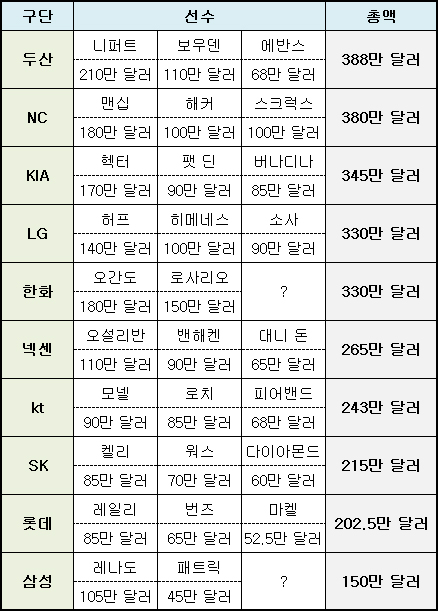 10개 구단 중 외국인 선수에 가장 공을 들인 구단은 지난해 우승팀 두산 베어스다. 두산은 니퍼트와 210만 달러에 재계약한 것을 비롯해 보우덴(110만 달러), 에반스(68만 달러)를 모두 붙잡으며 388만 달러를 지출했다.