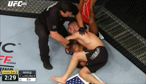지금까지 누르마고메도프의 그래플링은 모든 상대에게 평등(?)했다. 그라운드가 약한 선수를 뛰어넘어 같은 레슬러는 물론 뛰어난 주짓떼로까지 가리지 않았다. 누르마고메도프에게 상위 포지션을 내주면 누구든 아무것도 하지 못했다.