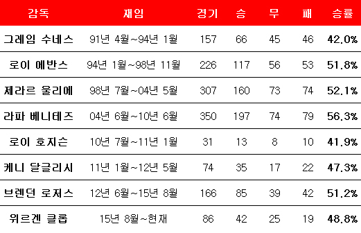 실제로 1992년 이후 팀을 맡았던 8명의 감독들 중 최고 승률은 2004년부터 2010년까지 6년간 이끌었던 라파엘 베니테즈다. 베니테즈는 가장 많은 350경기를 지휘했는데 197승 74무 79패(승률 56.3%)를 기록하며 챔피언스리그와 FA컵 우승을 각각 1회씩 차지했다.