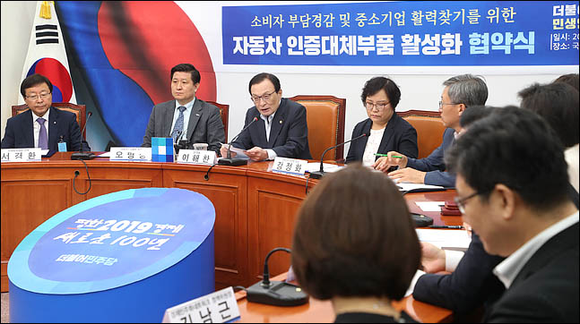 이해찬 더불어민주당 대표가 13일 국회에서 열린 자동차 인증대체부품 활성화를 위한 협약식에서 발언을 하고 있다.