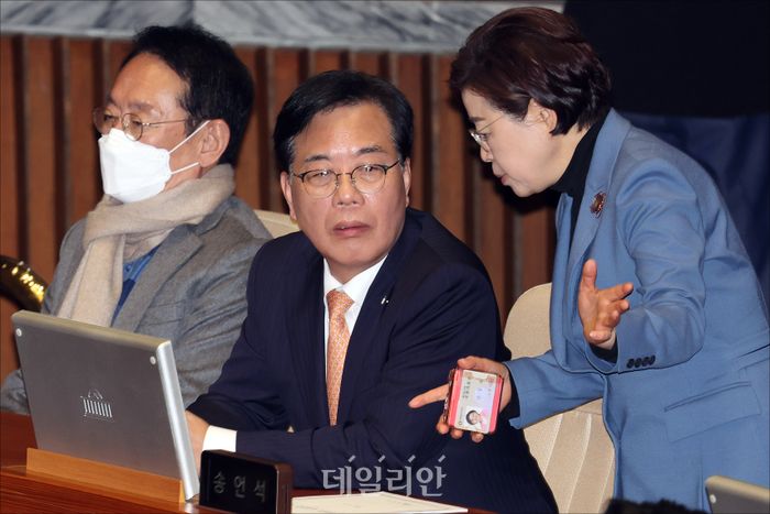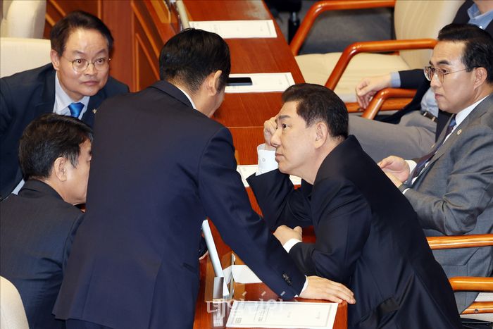비공개 의총 참석하는 민주당 김병기-문진석